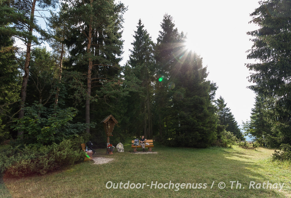 Aber nachdem wir kurze Zeit später auf eine Wegmarkierung mit dem Namen „Knieschnäpperle“ stoßen, liegen wir mit dieser Vermutung wohl daneben. „Als Knieschnäpperle bezeichnet man steile Anstiege, bei denen es dem Wanderer beim Hinuntergehen sozusagen ins Knie ‚fährt‘“, erklärt uns am nächsten Abend unser Herbergsvater Siegfried Radzuzweit in Mühlheim. Nach einem weiteren Forstwegabschnitt geht es dann auf einem sehr schmalen wurzeligen Pfad steil den Berg hinauf. Oben angekommen fühlen wir uns wie nach einem Saunagang mit Aufguss. Wir marschieren über eine Hochfläche und knacken wenig später den zweiten Tausender, den Aussichtspunkt Kehlen/Weißes Kreuz. Von der Bank direkt unter dem Kreuz genießen wir den Ausblick in den Schwarzwald und die Baar. Direkt unter uns liegt Gosheim und wir können wunderbar unseren Zustieg auf den Lemberg nachvollziehen. Ein Surrton in den Ohren, kündigt den höchstgelegenen Segelflugplatz Deutschlands, das Klippeneck an. Wir bleiben nun auf der gewonnenen Höhe und wandern auf Wiesen- und Waldwegen, immer wieder mit Ausblick in Richtung Flugplatz.