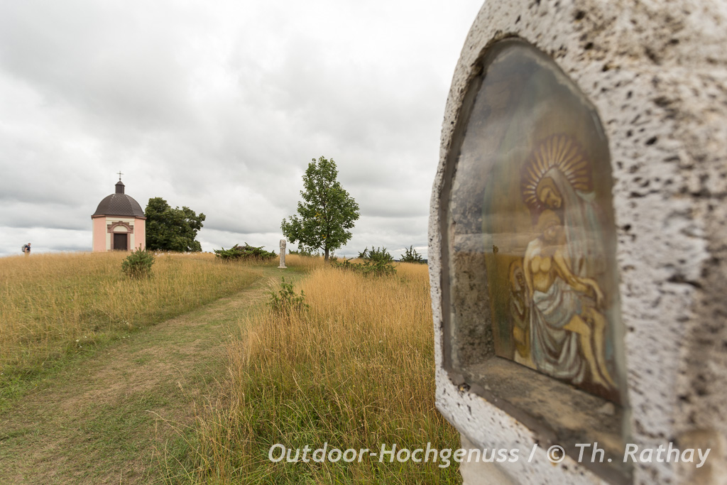 Nach diesem idyllischen Abschnitt geht es dann weiter auf Asphalt durch eine riesige Wiesenfläche in Richtung Böttingen. Eine mächtige alte Linde, eine kleine Kapelle und eine verwitterte Bank sind ein gutes Plätzchen, um die ruhige, malerische Atmosphäre zu genießen. Nach Böttingen gelangen wir über das Industriegebiet und den Friedhof. Hier ist fast nichts los, auf einigen Gehwegen wird der Besen zur Kehrwoche geschwungen, einen kleinen Laden für Getränkenachschub suchen wir vergeblich. Der Alte Berg (980 m) thront über dem Ort und wir wandern zielstrebig durch das Naturschutzgebiet hinauf und sind fasziniert von den Wacholderheiden und Albdisteln, die wir hier entdecken. Auf jeder Seite der rosafarbenen Kapelle gibt es eine Sitzbank und somit können wir den 360 Grad-Blick in die Landschaft richtig auskosten. Nur wenig entfernt, steht die „Papstbank“, die anlässlich des Papstbesuches 2011 in Freiburg aufgestellt wurde. Von hier hat man die perfekte Sicht in die Allgäuer und Lechtaler Alpen, auf die die angebrachte Schautafel hinweist. Wir können uns gar nicht satt sehen, an der blaugrauen Hügelsilhouette, die sich vor uns abzeichnet.
