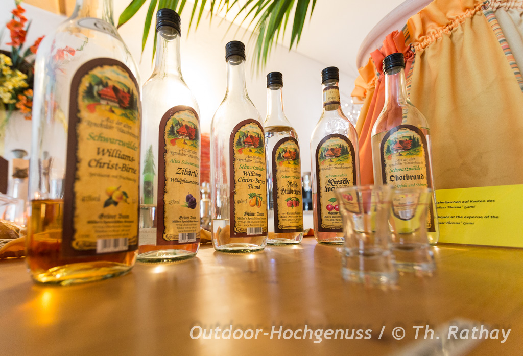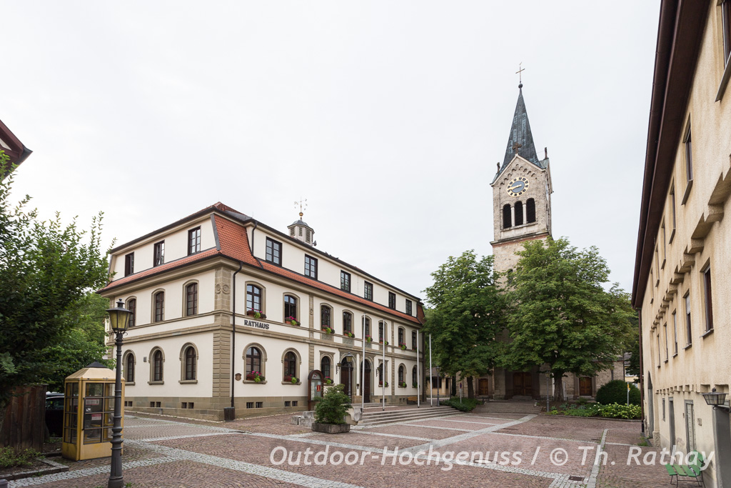 In unserer Pension Theresia, die sich in der ehemaligen Brauerei zwischen dem Vorderen und Alten Schloss befindet, begrüßt uns der Chef Siegfried Radzuzweit. „Wenn Sie heute noch eine Wandermassage brauchen“, sagt der gebürtige Mühlheimer und weist schelmisch lachend auf die Schnapsflaschen im Aufenthaltsraum, „dann bedienen Sie sich einfach hier.“ Nach einer Dusche und einem Kirschwasser aus der „Massagebar“ sind wir am blutroten Rathaus aus dem 14. Jh. zur Nachtwächter-Tour verabredet. Im schwarzen Rock mit Laterne, Spieß und Horn bestückt, leitet uns der Nachtwächter durch die Gassen der Oberstadt und lässt uns teilhaben an der spannenden Geschichte des im 12. Jh. gegründeten Mühlheims mit seinen heute rund 3500 Einwohnern. Immer wieder bleibt er an kleinen Sehenswürdigkeiten stehen und trägt seine gesungenen Verse vor, „Hört ihr Herrn und lasst euch sagen…“.